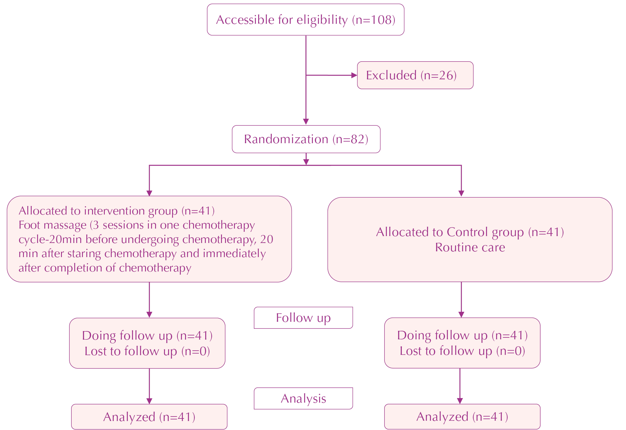 Foot massage was given to the patients in three sessions, 20 minutes before starting chemotherapy, 20 minutes during chemotherapy and immediately after completion of chemotherapy. Each session took 20 minutes (10 minutes for each leg). And the post- test was done 48 hours after undergoing chemotherapy, through a phone call. In the control group pretest was done before undergoing chemotherapy, and they received routine care, and the posttest was done after the end of the study after undergoing routine care.